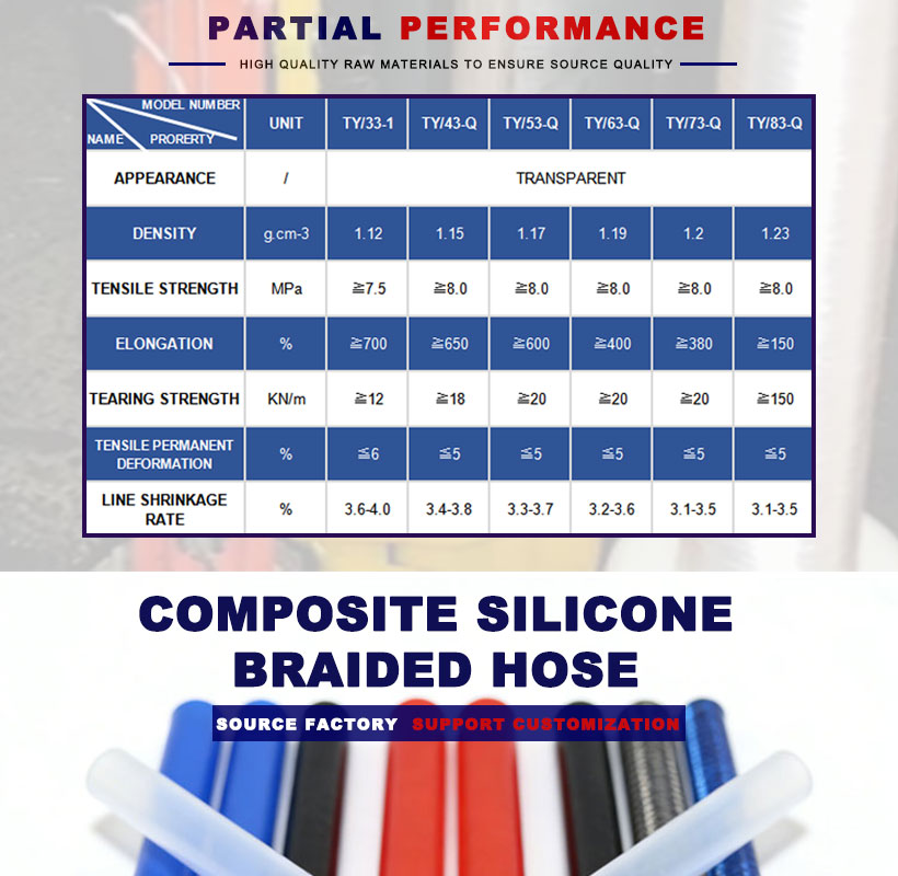 Термостойкость: от -60 до - 200 (стандартный тип); Рабочее давление: 2,5-6,0мпа (зависит от плетеного материала); Огнестойкость: UL-94 V0 (настраиваемая); Водонепроницаемость: IP67-IP68 (в зависимости от конструкции); Химическая стойкость: к слабым кислотам PH1-3, слабым щелочным и минеральным маслам PH11-13; Соответствие требованиям сертификации: FDA 21 CFR 177.2600, LFGB, RoHS, USP класса VI.