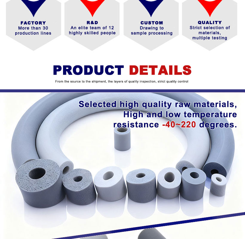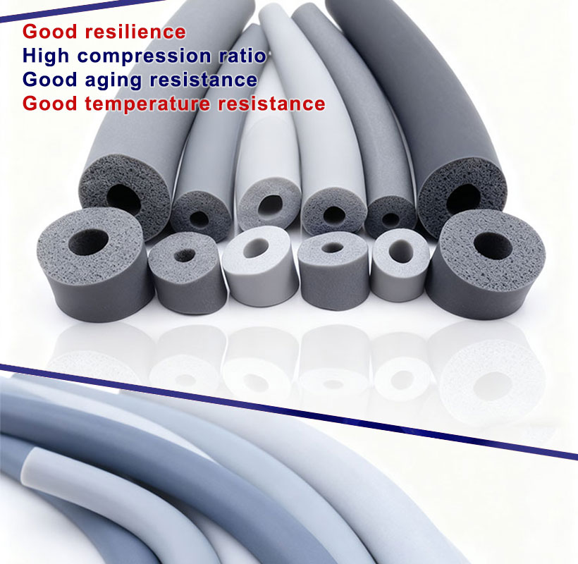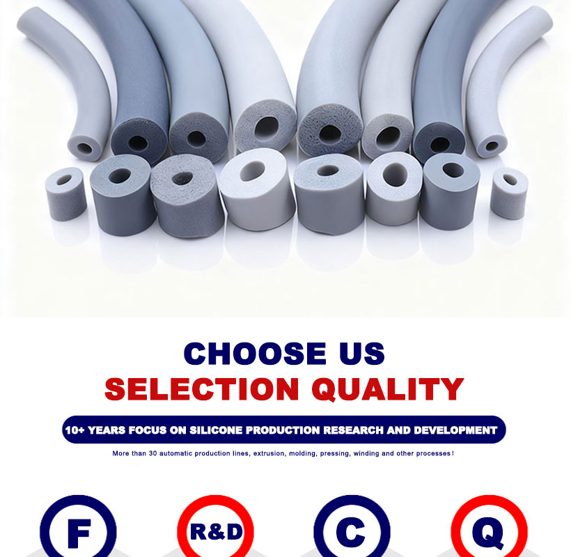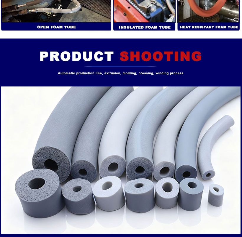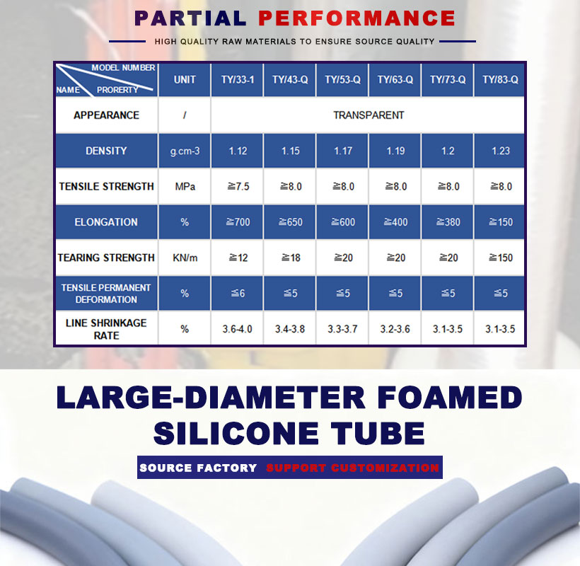Силиконовое сырье: твердость по шору 5-50A, прочность на растяжение ≥ 3,2mpa; Процесс пенообразования для больших диаметров: управляет размером камеры 0,2-0,5 мм, обеспечивая равномерную плотность (0.35- 1.0г/см) по всей трубе.
